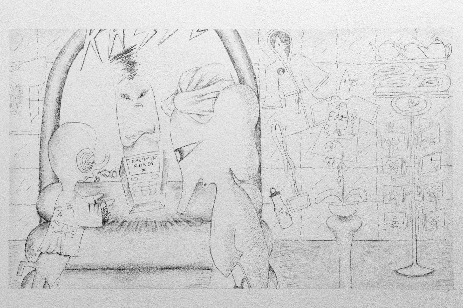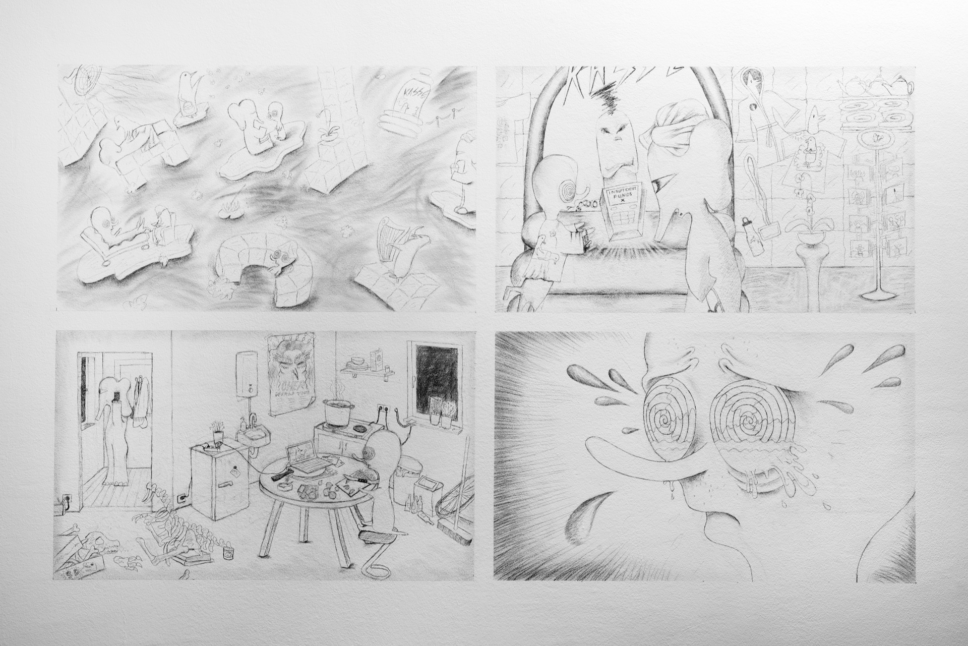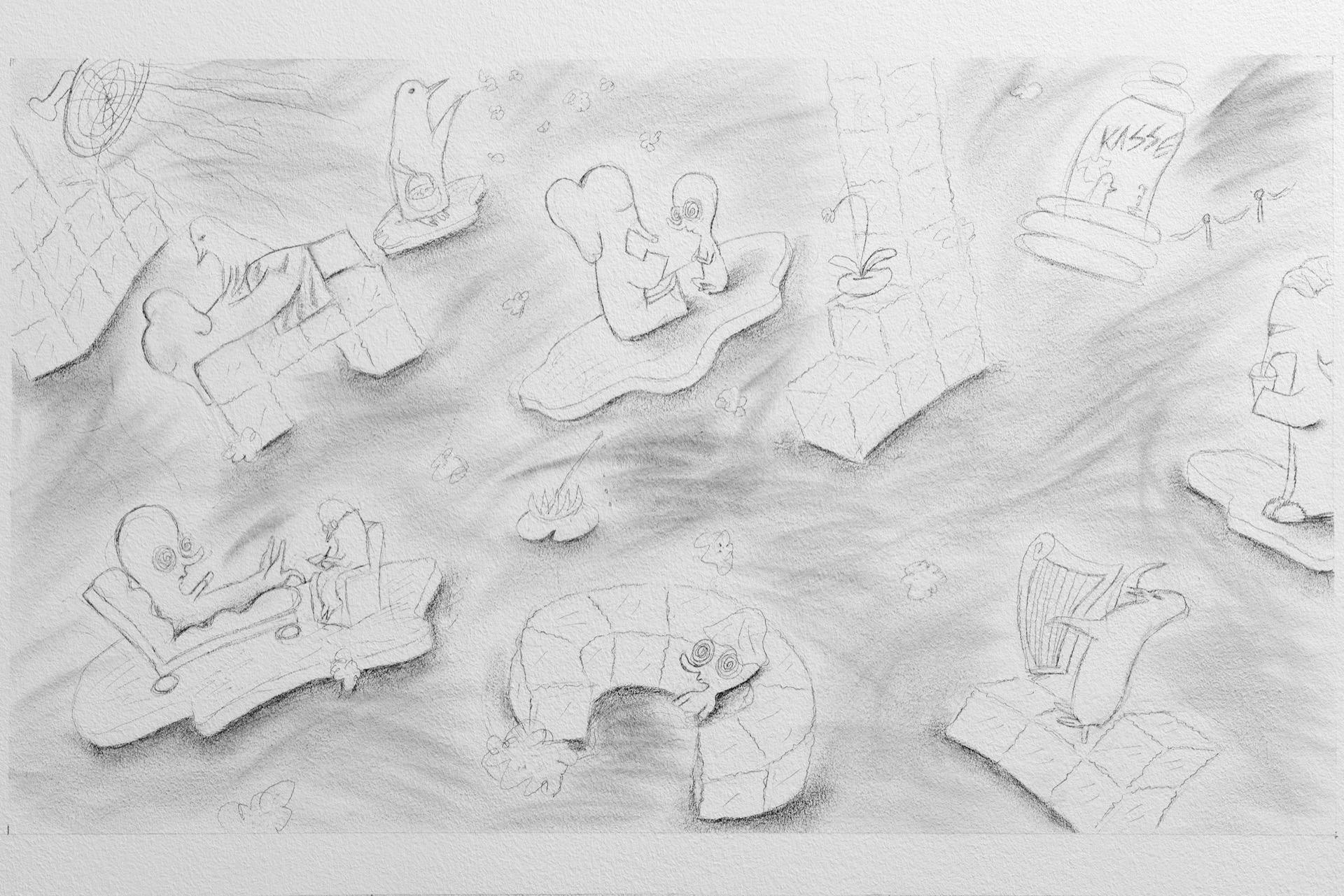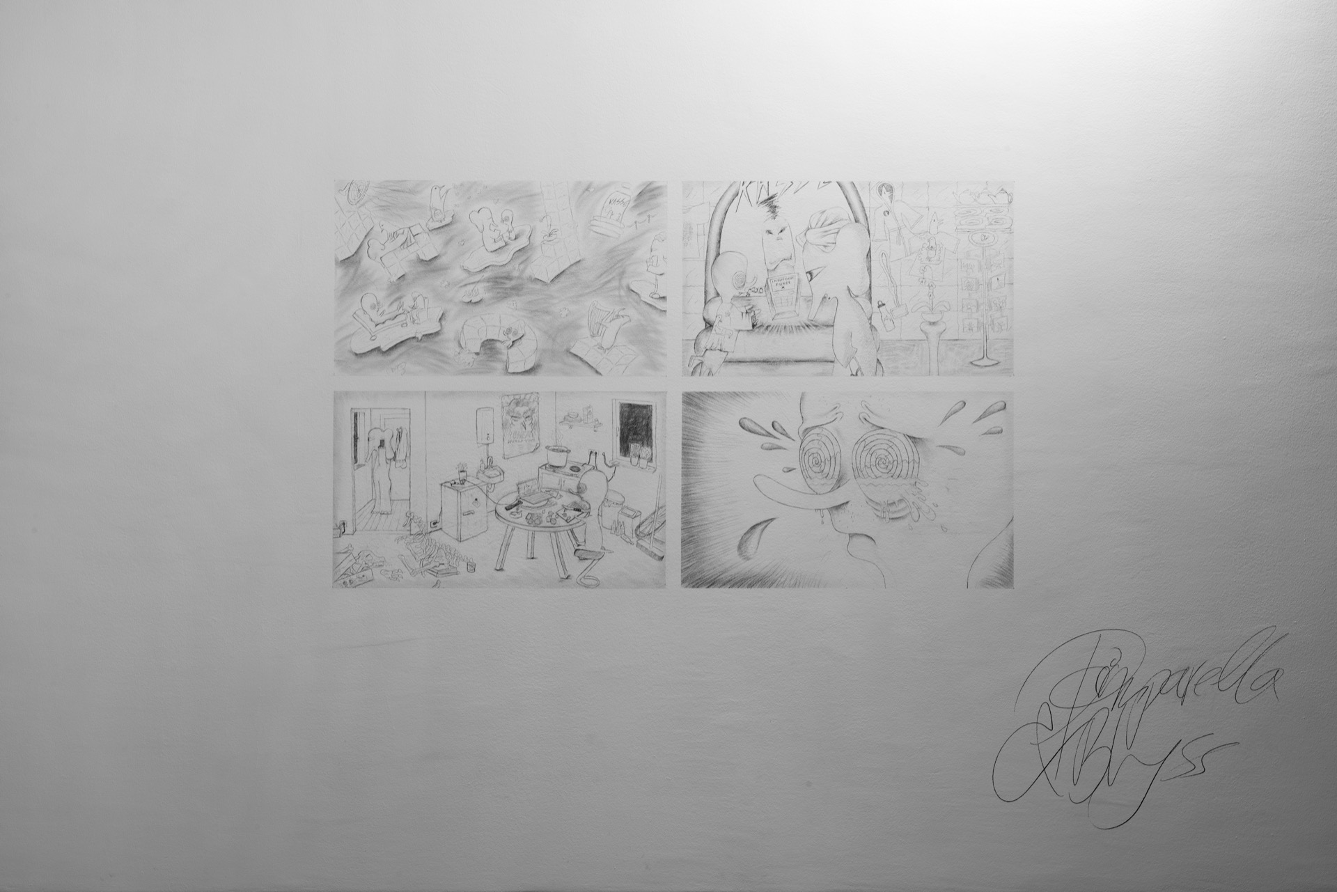 Das Video von Lea Stein, das der Ausstellung ihren Titel leiht, zeigt Abwandlungen der immer gleichen Figur, die miteinander durch ein „hmmm“ kommunizieren. Genau wie diese Figuren können sich auch „hmmm“´s je nach Tonfall trotz ihrer grundsätzlichen Übereinstimmung deutlich unterscheiden: skeptisch, schwärmerisch, begeistert, zustimmend, gleichgültig, überrascht, nachdenklich, enttäuscht.