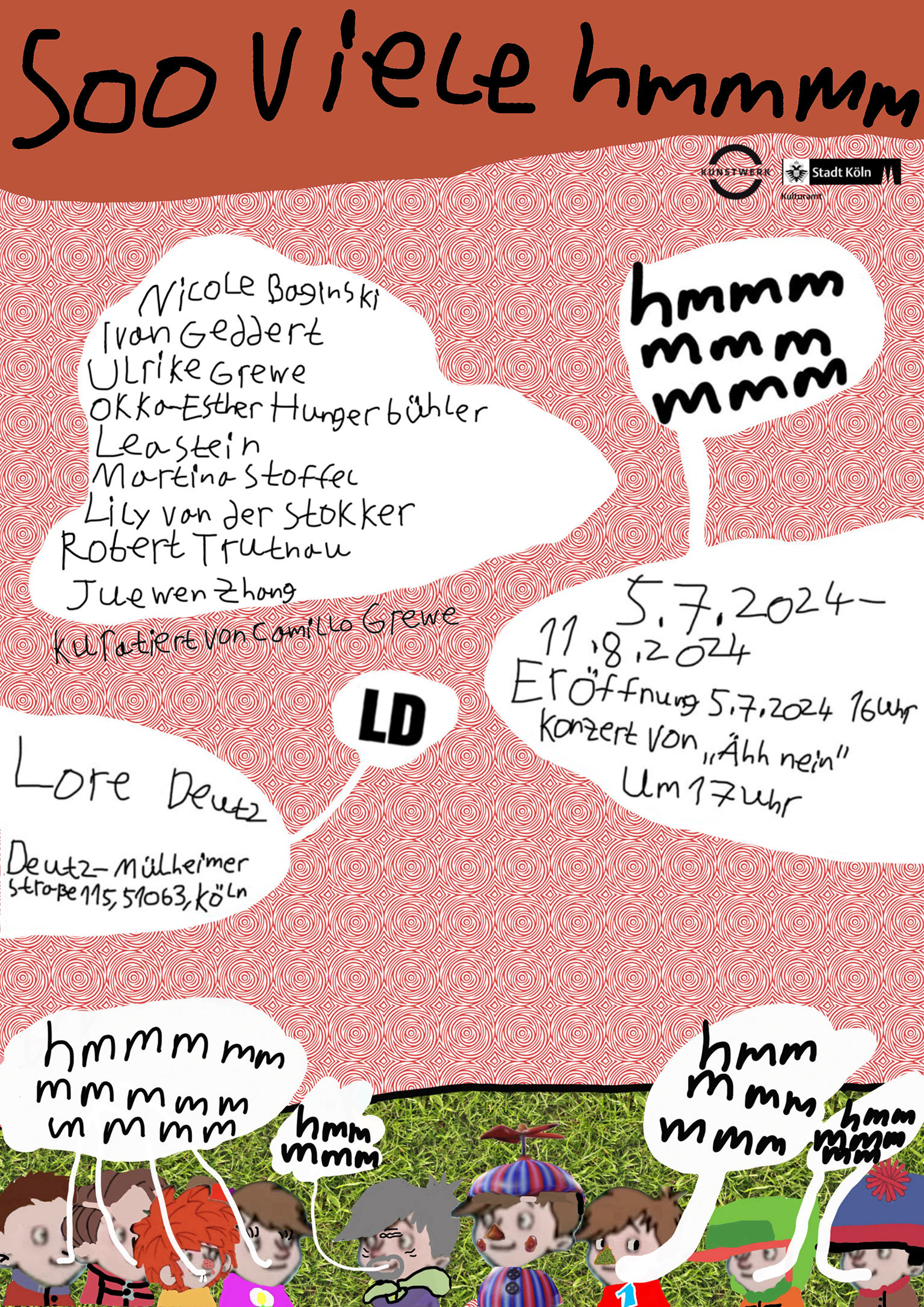 Die Ausstellung „Soo viele hmmmm“ bringt neun künstlerische Positionen zusammen und will einen Kommunikationsraum schaffen, in dem die Werke wie Gesprächspartner*innen mit unterschiedlichen Beweggründen in Verbindung treten. Die ausgestellten Werke handeln in einer stillen und zuweilen geräuschvollen Versammlung Anliegen aus, die sich in der Begegnung ergeben. Emotionale Beteiligung, handwerklicher Stellenwert und konzeptionelle Ausrichtung fallen dabei unterschiedlich ins Gewicht.